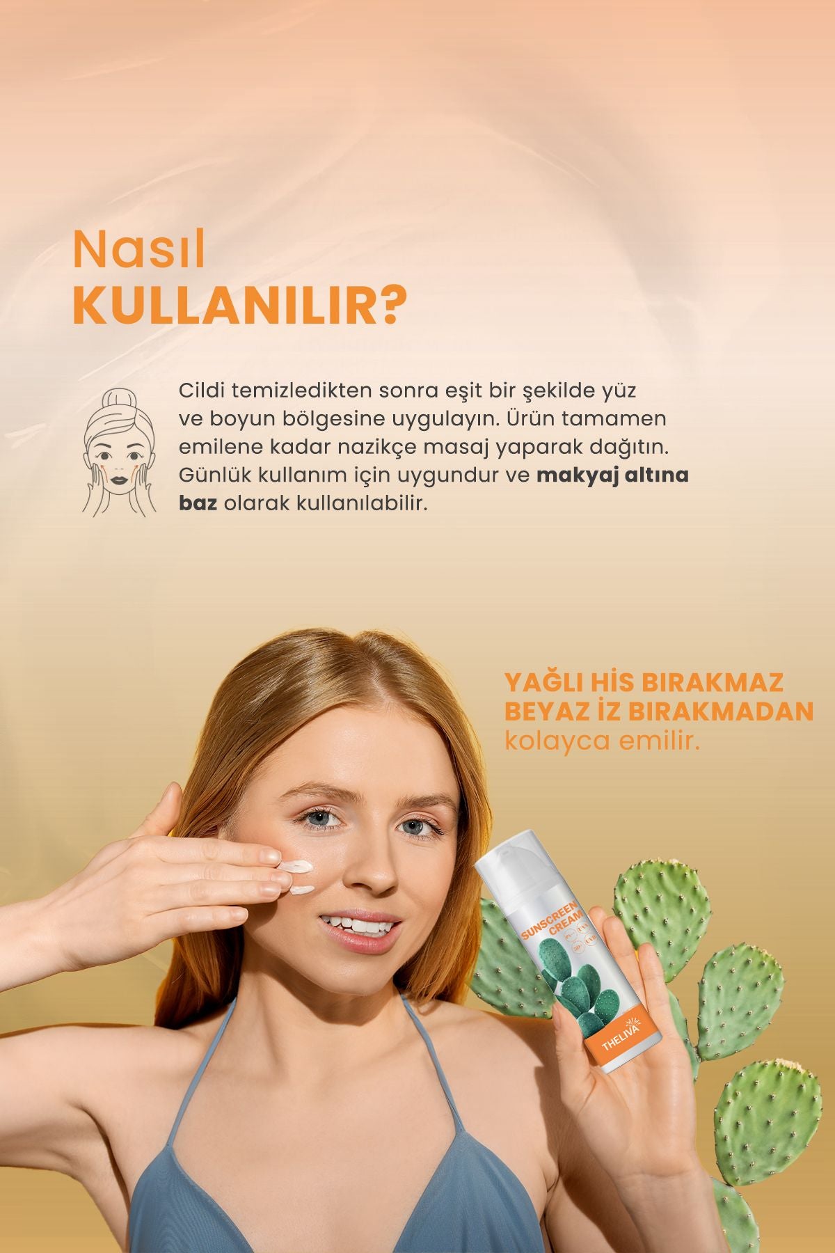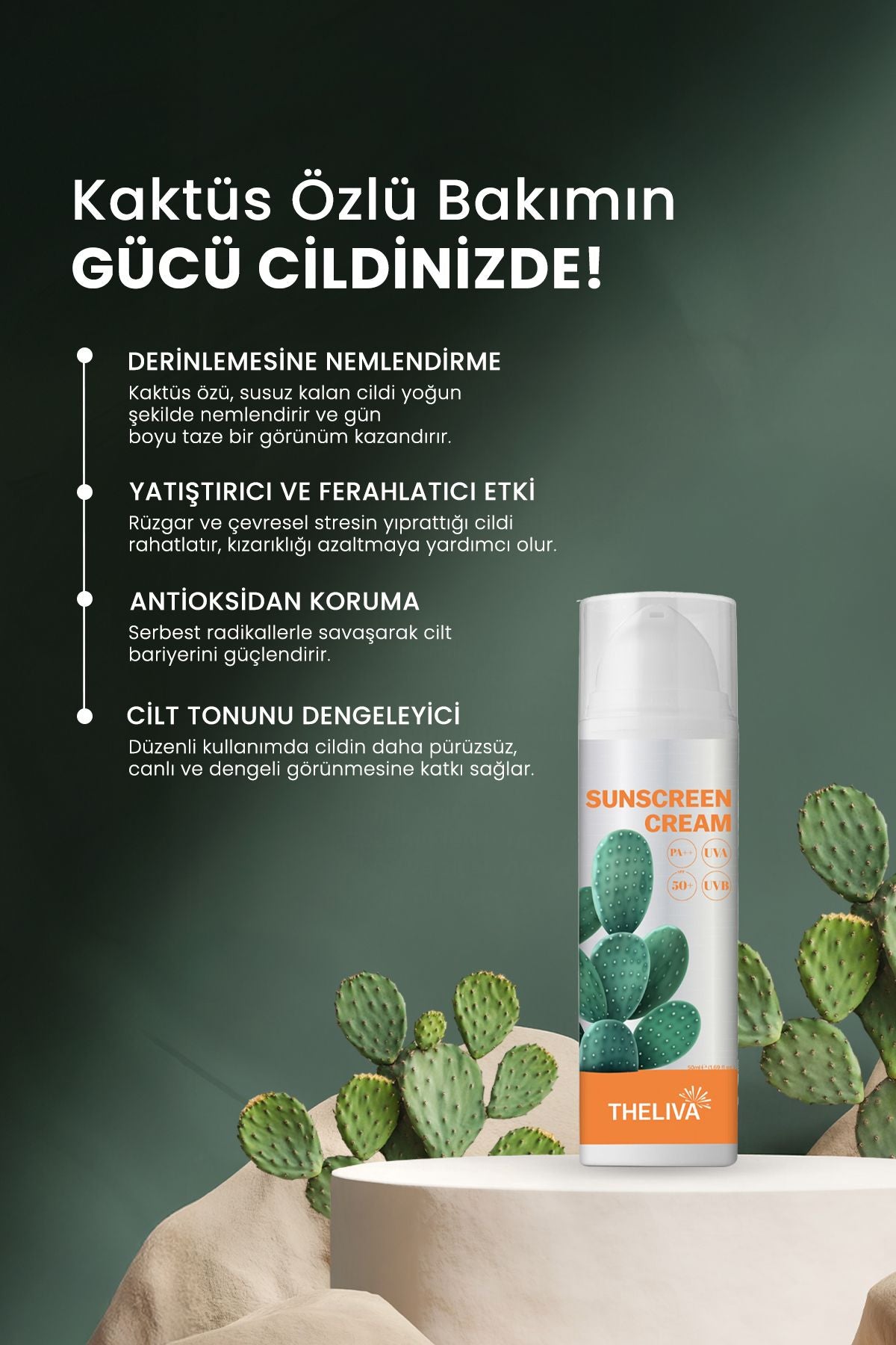 THELIVA Sunscreen SPF 50 effectively protects your skin against harmful UVA and UVB rays. Its lightweight, oil-free formula absorbs easily. Enriched with Opuntia Ficus-Indica Flower Extract and Shea Butter (Butyrospermum Parkii), it helps support the skin's moisture balance.