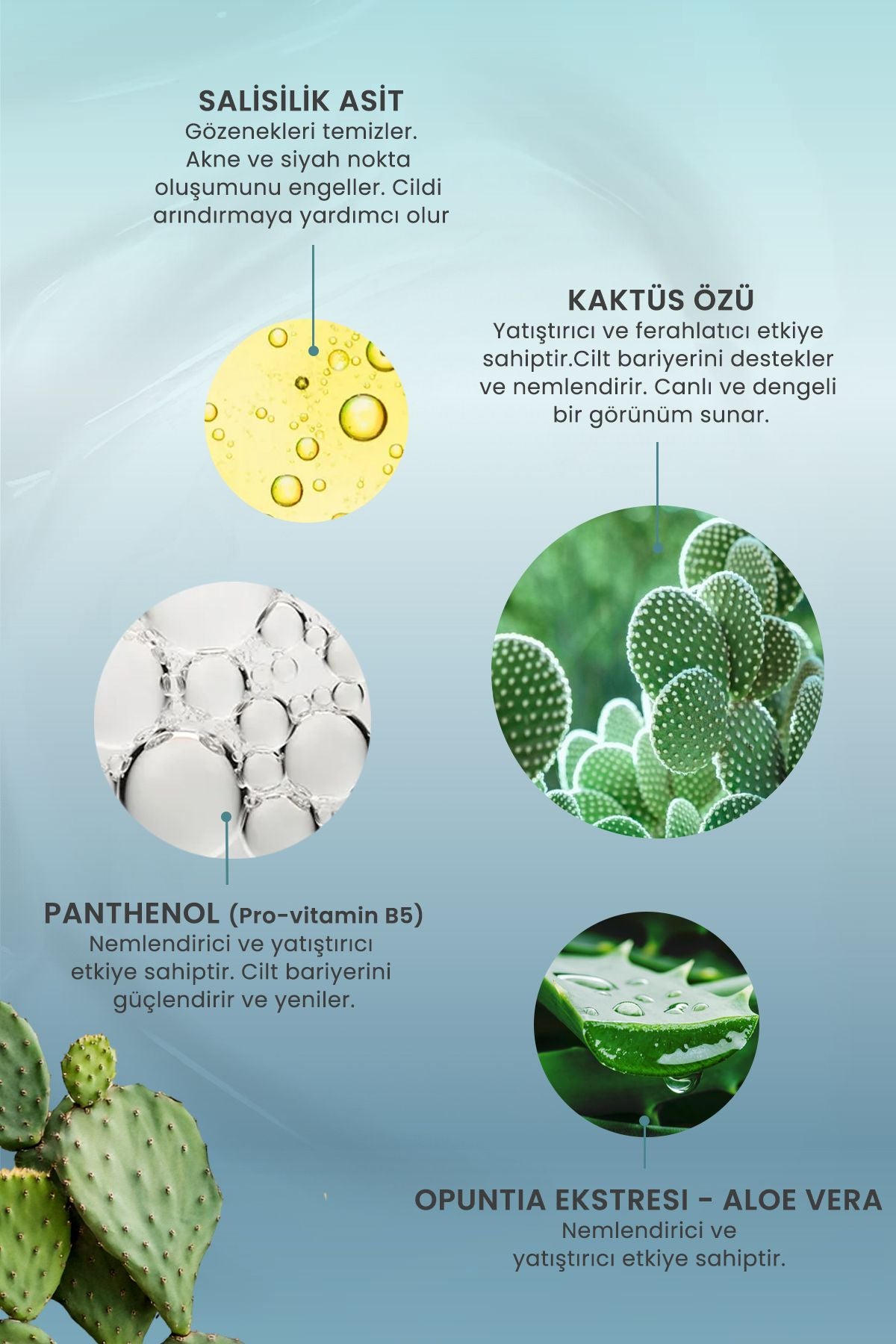 The formulation supported by cactus extract and active acids aims to make the skin look healthy, balanced and bright.